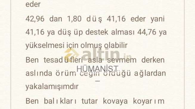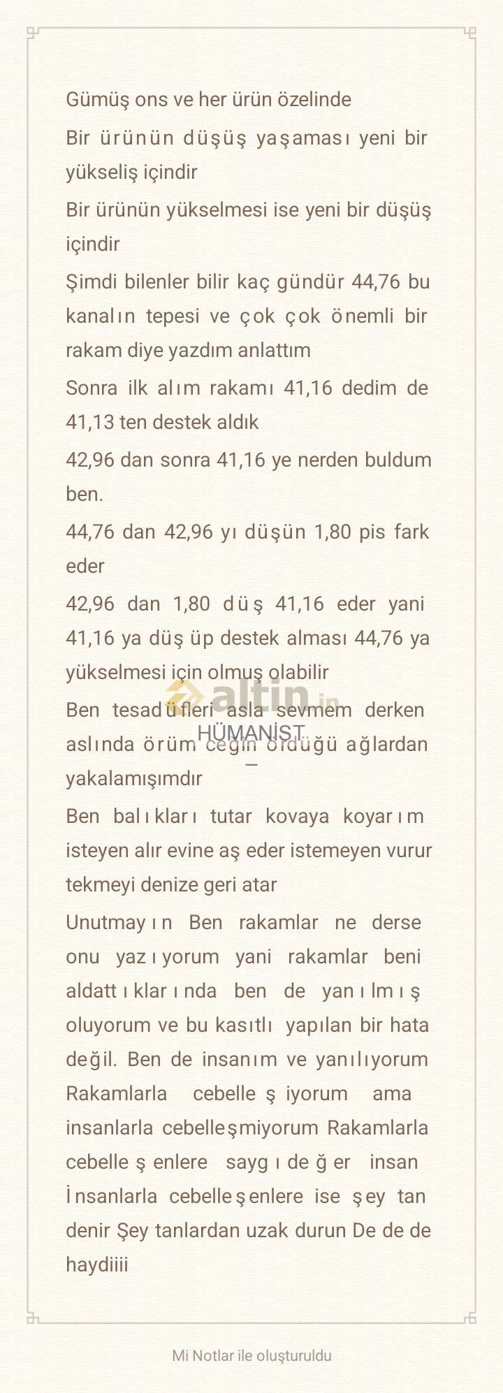 Gümüş için HÜMANİST_ yorumu ()Bence de gümüş ons en fazla 44,76 hadi bilemedin 46,33 ten sonra sert satış yeyip minimum 38,42 ye düşmeden 49 ve 50 ons olmaması gerekiyor ancak fakat ama lakin olur mu olur çünkü buna karar veren etkili ve yetkili kişilerin keyfine kalmış herşey arkadaşım.
