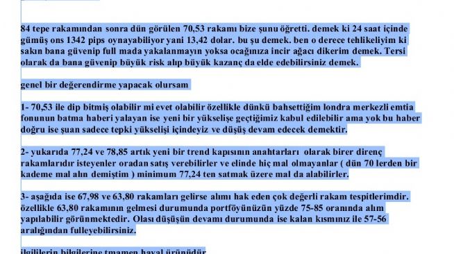 @Sümeyra_81 günaydın kardeşim. full satmayın diye bu sebeple diyorum zaten sizlere. 70,53 ile dip bitti ve ilgili haber yalan ise 88 ons hedefi olur ve bu ihtimal için elinde hep bir kademe ons bulunsun. 77-78 lerden satış yapılır ama full değil. gümüşten korkmak akıllı insanların işi zaten. ben boşuna demiyorum gümüşü bilenler bilir bilmeyenler ise öğrendiğinde iş işten geçmiştir vesselam...
