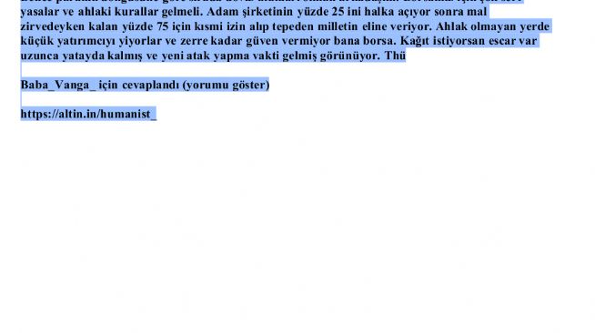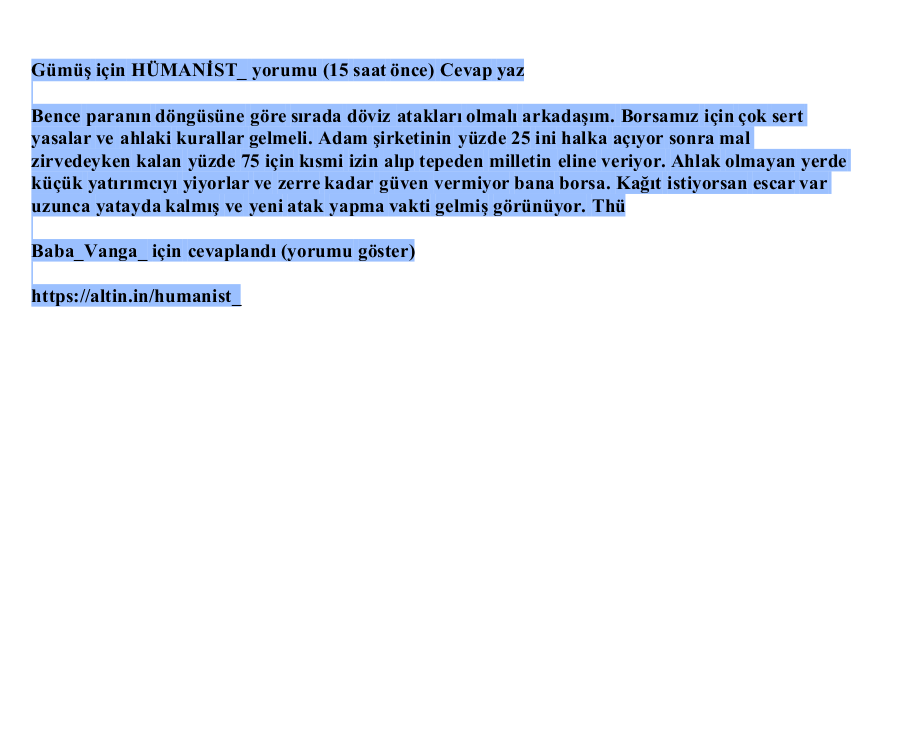 Gümüş için HÜMANİST_ yorumu ()Hımmm bugün bana negatif enerji veren kişi sizsiniz sanırım ama bu seferlik kızmıyorum çünkü sizi anlayabiliyorum arkadaşım. İnşallah en kısa zamanda zarardan çıkarsınız kar yazarsınız çünkü ben sizi tutuyorum