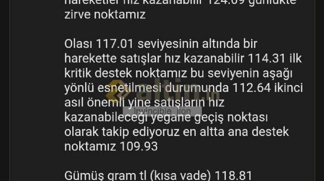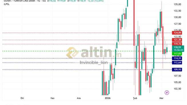 gümüş gram tl günlük pivot 117.01 destekler 114.31 112.64 109.93 dirençler 119.72 121.39 124.09