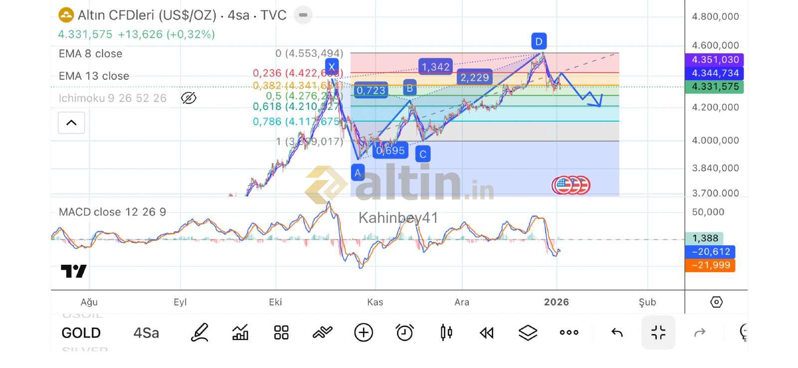 4210 beklentim var ilk etapta. Eğer grafik yeni zirve ve retest yapmadığı sürece bearish taraftayım.