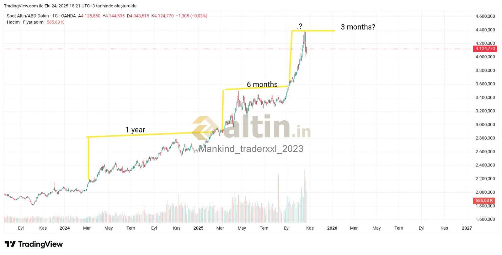 Ons için Mankind_traderxxl_2023 yorumu ()Bundan on yıl önce 2015te hesaplamalar paylaşmıştım hatta kovid zamanında 2019 da da şöyle bir rakam vermiştim ons için hahaha 7200 demiştim uzunda diye bu son bir kaç aydır 7000 ler milletin ağzında fon yöneticilerinin paylaşımlarına da görüyorum kendi kendime soruyorum laa bu rakamları verirken kimse onsun 1912 usd üzerine çıkacağına bile inanmazken acaba milletin ağzına bu rakam benim söylemem yüzünden mi girdi ve hesaplamalar ı unutup ben bile kendime bu rakamı ben söyledim ve millet inandı ve o tohum bu yüzden mi ekildi