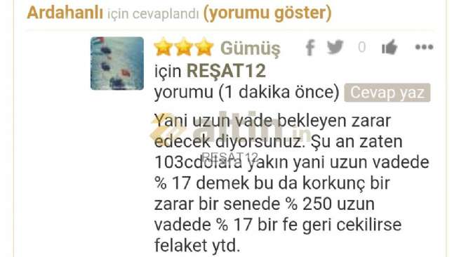 Gümüş için REŞAT12 yorumu ()Yani uzun vade bekleyen zarar edecek diyorsunuz. Şu an zaten 103cdolara yakın yani uzun vadede % 17 demek bu da korkunç bir zarar bir senede % 250 uzun vadede % 17 bir fe geri cekilirse felaket ytd.