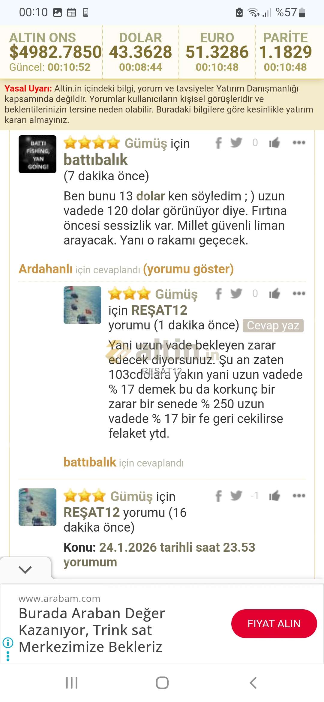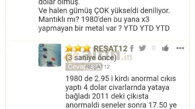 Gümüş için REŞAT12 yorumu ()Ben de altını n altında ucurum var 1200 600 dolar olur hedefi verdiklerinde 3400 hedefi vermiştim gümüş 17.50 iken de 8 dolar olmadan 1 gram alinmaz diye tutturuldu cok yukarı hedefler verdim birini şu anda geçti ikincisini yazmiyorum çünkü yikarı yönlü manipulasyon var. Bu kadar kısa surede bu kadar artişin başka izahı yok. Ne zaman ne yazmak gerekiyorsa hepsini yazdım. Siz bu seviyelerden satmak yerine hâla almaya veya tutmaya teşvik edip enflasyonun uzerinde artar diyorsanız o da sizin sorumluluğunuz. Ben artmaz diyorum bu da benim sorumluluğum. Gümüs 103 dolara yakın seviyeleri gördü ne dusunuyorsam hep paylaştım 6 sene tek hesapla kimseyi engellemeden buradayim birada olmaya da devam inşaallah. Ytd