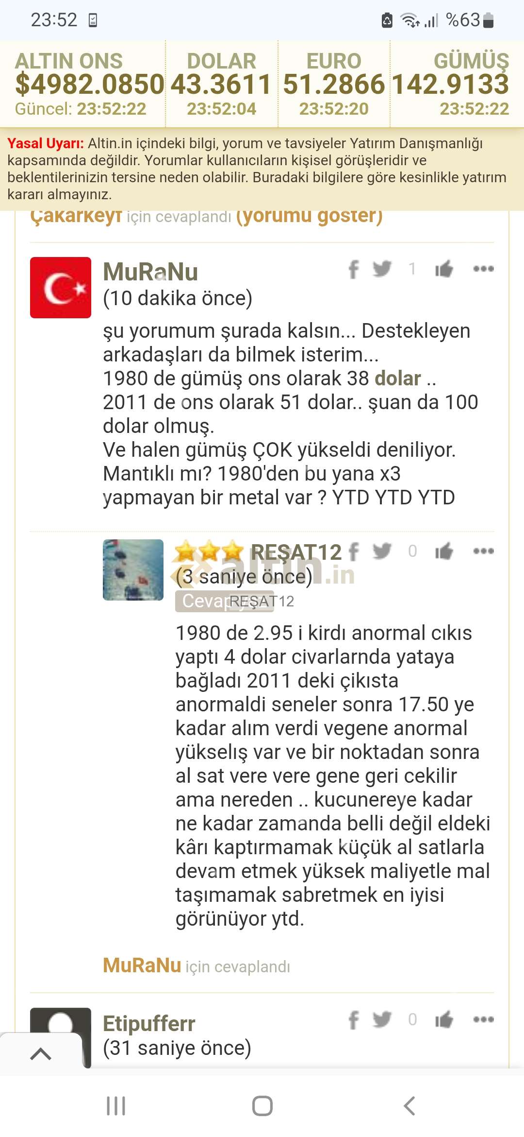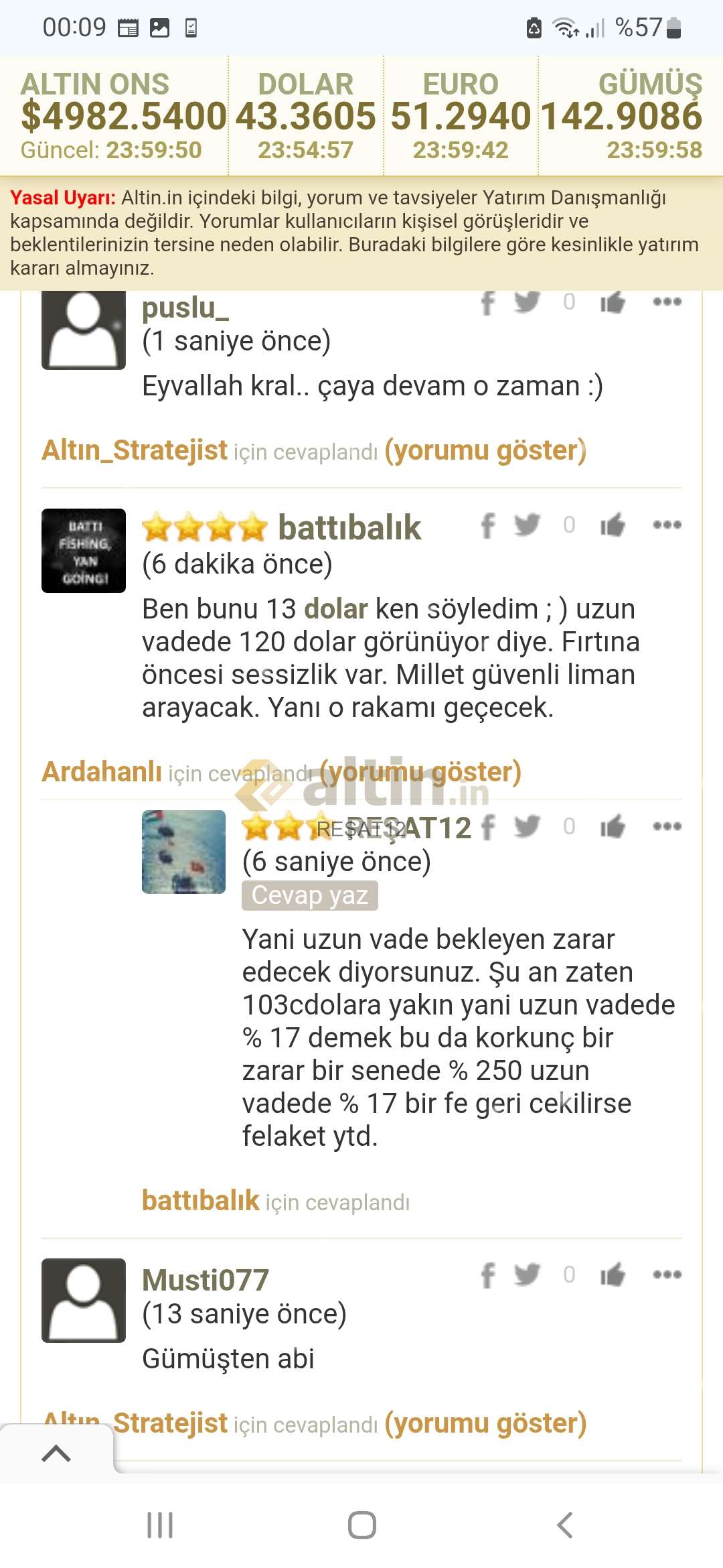 Gümüş için REŞAT12 yorumu ()Alt yorumda 4570 dolar seviyesinde yukarıdan satilanlar geri alinabilir yazmıştim. 4983 dolar olmuş. Yorum zamanında yapılırsa degeri olur manipülatorlerin verdikleri eksilere aldirış etmeden hatirlatmaya ve yazilanlarin fotosunu almaya devam. Not : Her ne kadar sayfamda 1085 takipçi görünüyorsa da belki de hiç takipçim yok kisilerin yazdıklarına dikkat edin manipulasyona gelmeyin ytd.