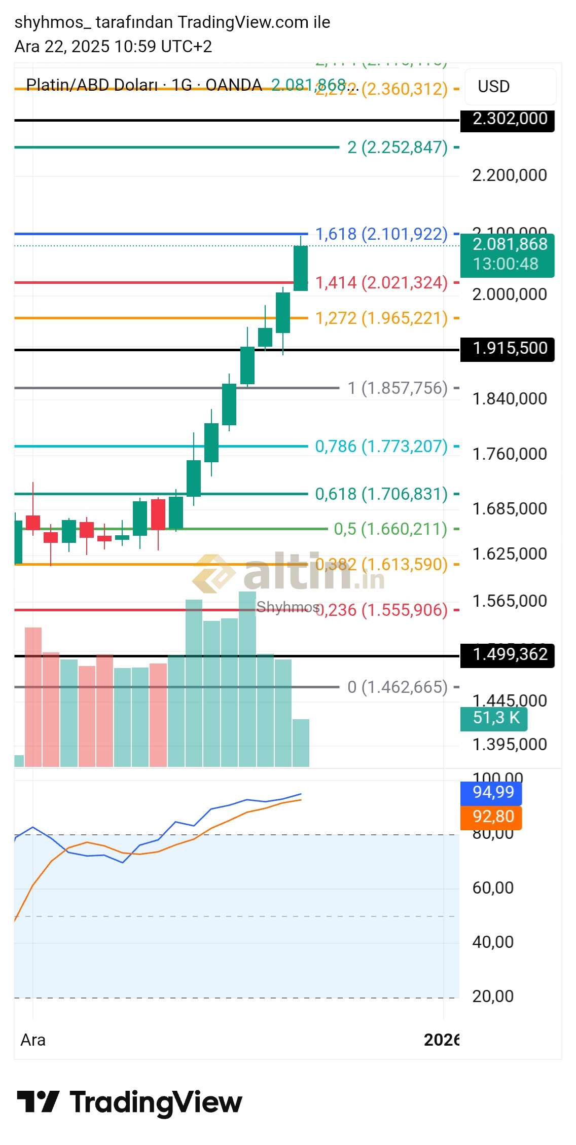 Platinde öngörülen 2000 ons seviyelerine yaklaştı. Henüz negatif bir durum görülmedi. Şimdilik önündeki direnç 1939.694 tutunamıyor maalesef. Geçmesi galinde üstünde 1993 anlamlı geçirirse 2060 ons dolayları potaya girer.