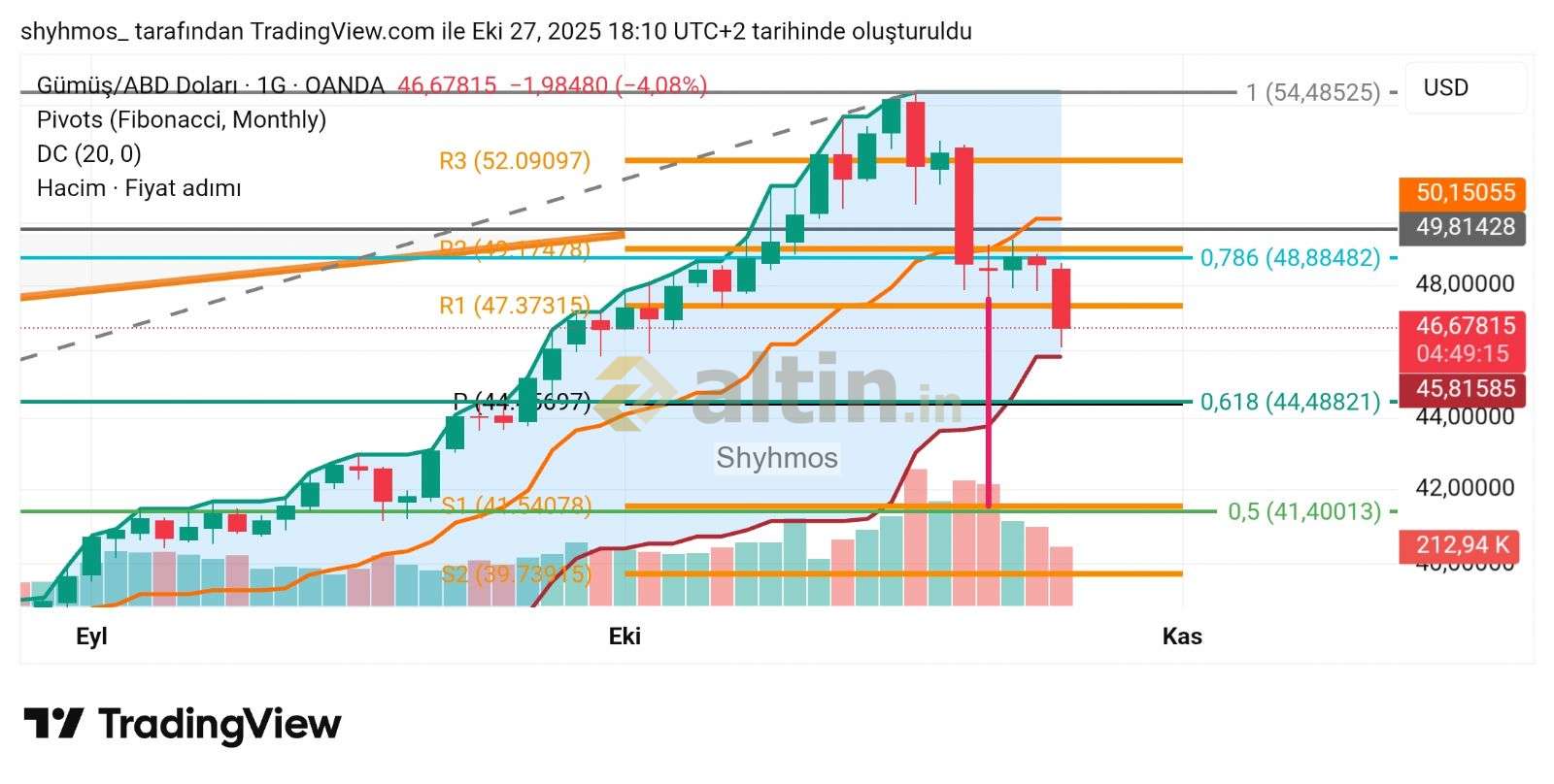 Kısada düşüşte hacim gittikçe düşüyor olsa da Donchian bandı negatif tarafta olmasından düzeltmenin devam etmesi ve normal düzeltmenin öngörülen bitiş yeri olan 44 seviyeleri; hem (fib. 0618) 44.48 hem de günlük (pivot) 44.45 noktası olan seviyenin güçlü destek olması olası. Altın da güçlü kapanış negatif!