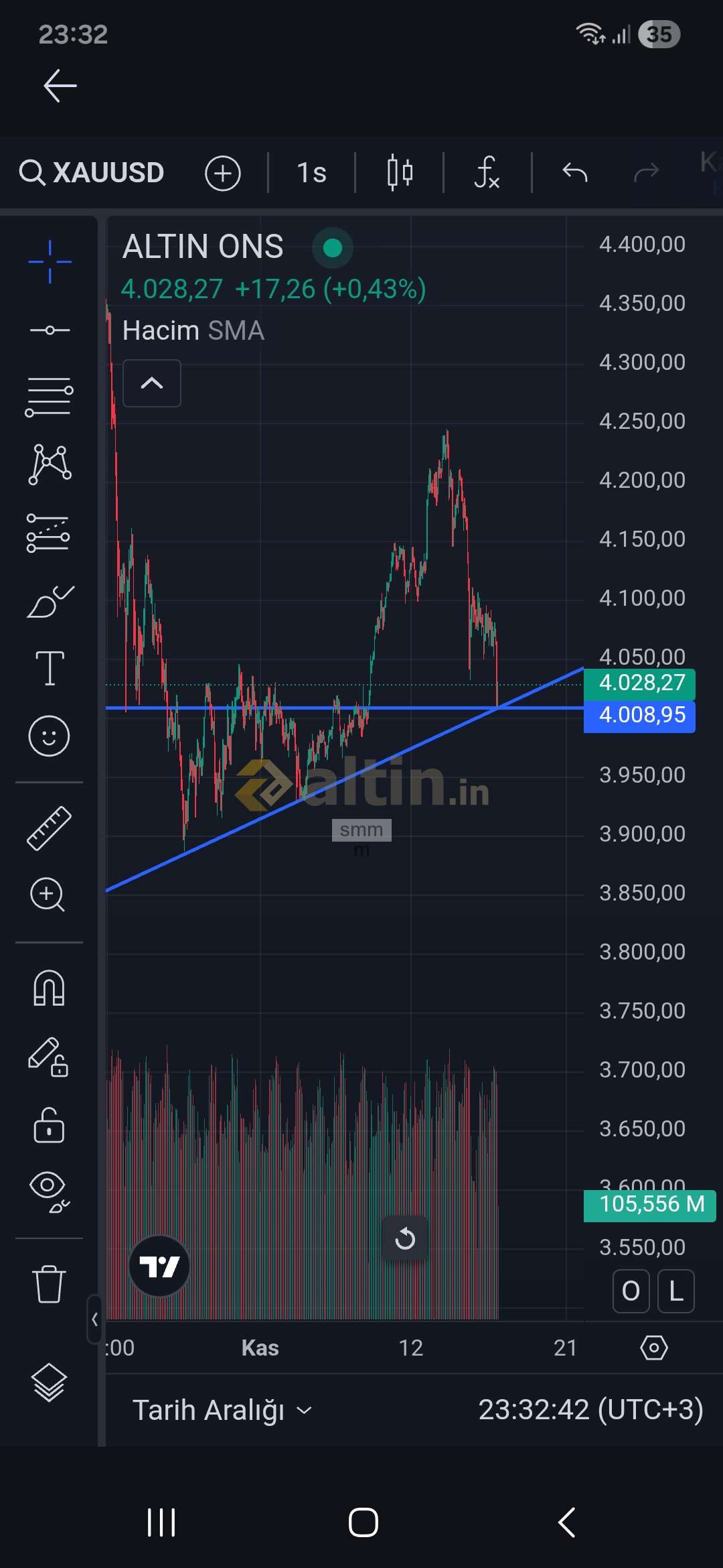 Ons için smmm yorumu ()Altin 2 ay önce 3400 usd imis 4370 e kadar çikmis yüzde 28 sonra yüzde 8 düsmus. 3400 zirvesini gorup 3200 e düsmustu 4 ay oyalanmisti sonra 4370 e kadar soluksuz cikti. Gene büyük ihtimal 6 ay güç toplayacak sonra gene yukari. tl dönsek usd firlarsa sıkinti. Yani burda en mantikli usd ye geçmek ancak makas payi yuksek ani yukseliste strese girip 4300 den geri altina donmek riski var gayrimenkul gibi ihtiyac varsa tam zamani yoksa belemeye devam