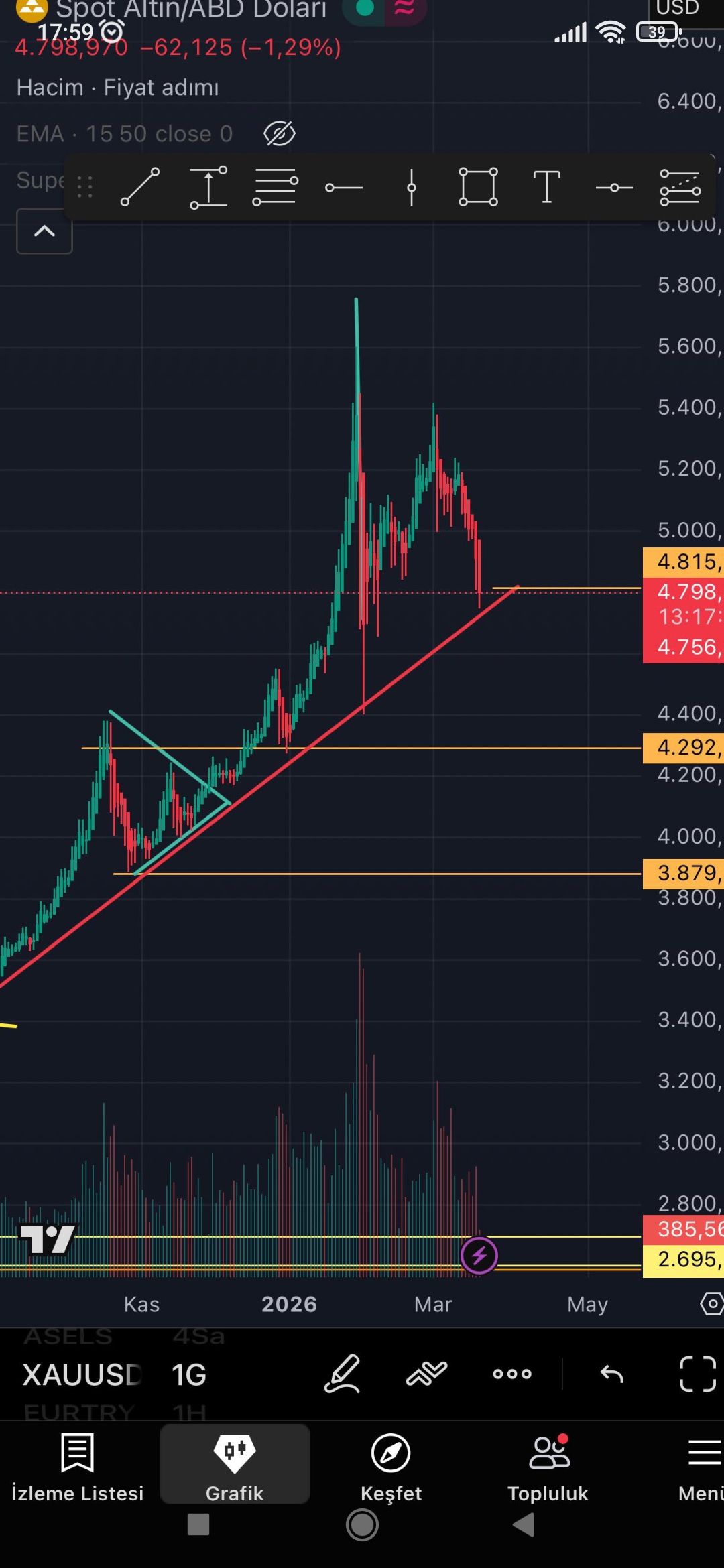 Bir arkadaş çizip attı sabah. Trend ihlali tehlike başladı diye. Onda dip işi daha aşağı. Ytd. Çizim yanlış olabilir mi
