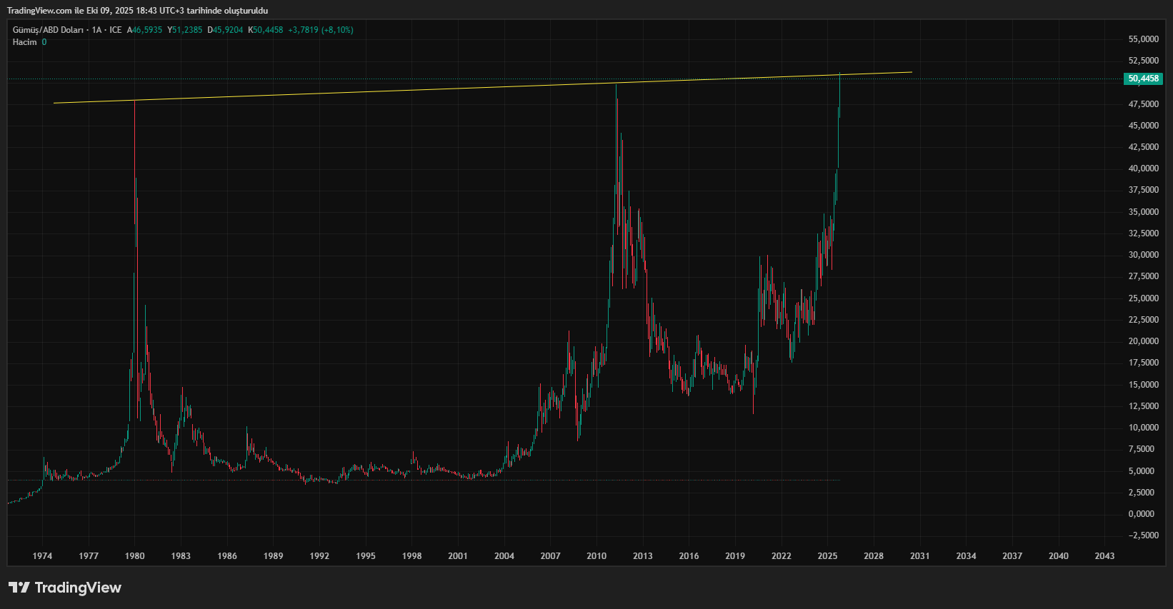 Gümüş için xxbirzamanlarxx yorumu ()gümüş 48 üstü bende yok demiştim ancak uzun vade grafik bakıyorum o grafiklerde 1 kaç dolar oynayabilir demiştim.. 51 üstünde formasyon bozulur.. muhtemelen 56 ya kadar gider...51 e kadar ola bilir bir durum..