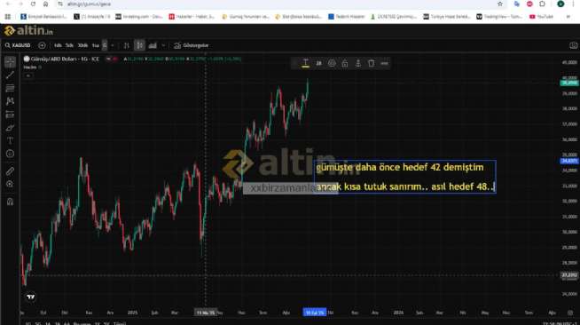 GÜMÜŞ 37 CİVARIYKEN HEDEF RAKAM YAZMIŞTIM. 42,8 DEMİŞTİM.. SONRA GRAFİK 42,8 DEN DÖNMEYECEK TARZDA OLUNCA YENİ RAKAM BELLİ OLMUŞTU.. HEDEF DAHA YUKSEKTİ..