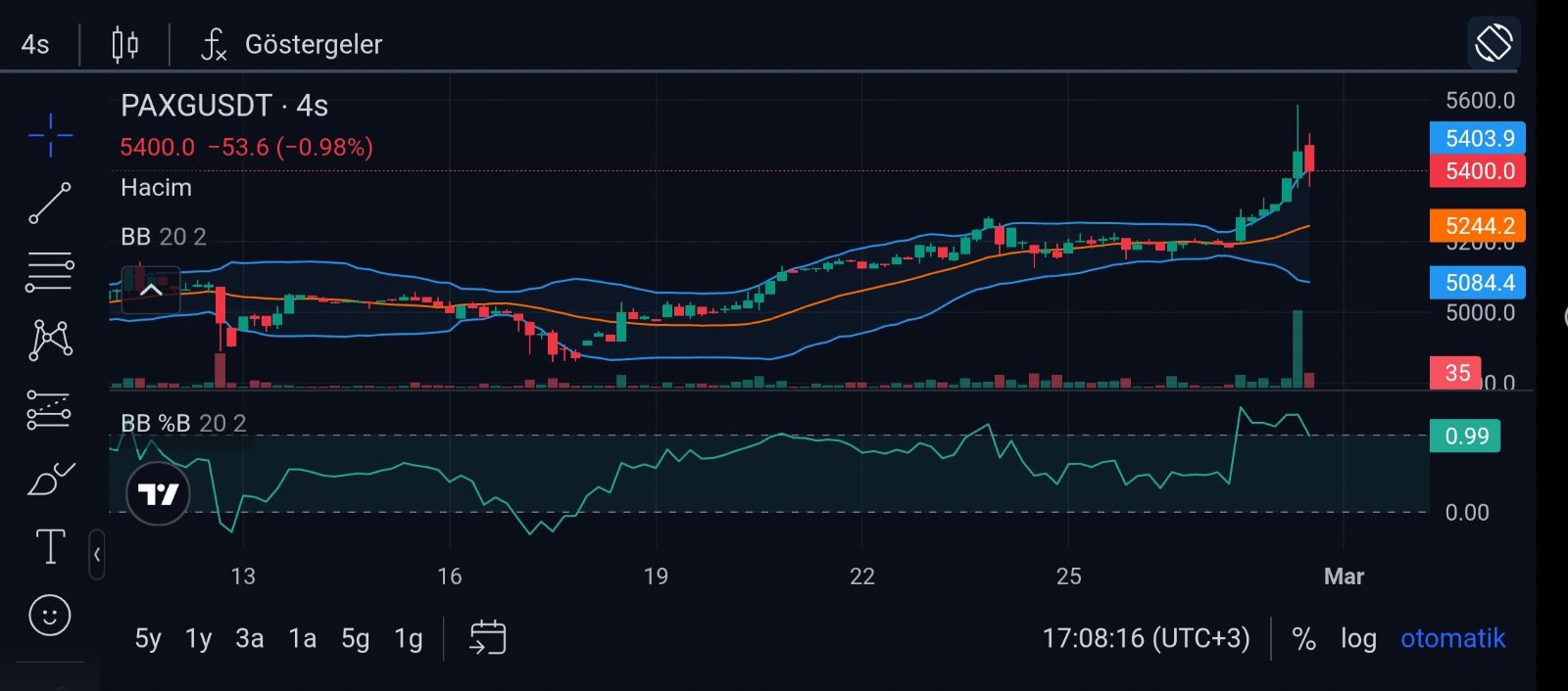 Gram Altın için Yön_Kuzeydoğu yorumu ()Teşekkürler kıymetli hocam, malum anlamıyoruz ama izninizle grafik ile ilgili bir sorum olacaktı. Üstteki bollinger bandı sanırım, grafiğin altındaki bant ve çizgi nedir hocam, kanaldan üste doğru taşmış olan. Hacim ile alakalı mı acaba. Saygılarımla. @Yön_Kuzeydoğu